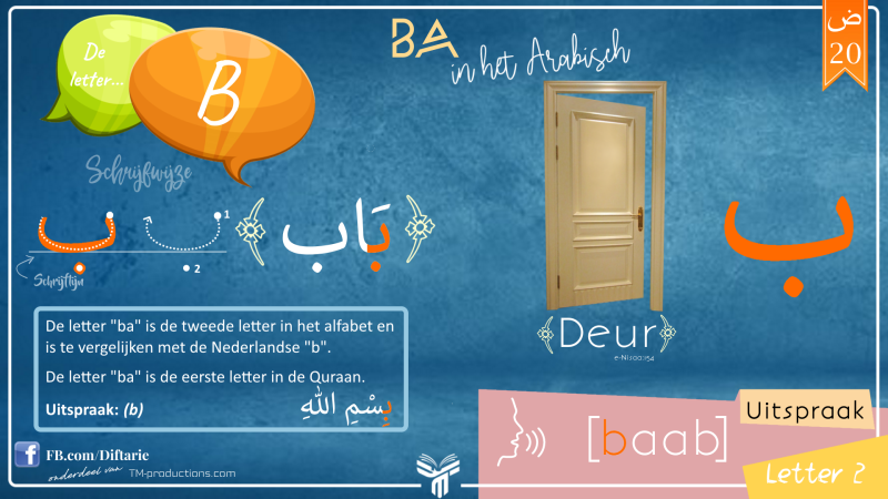 De tweede letter in het Arabische alfabet is de “ba” (ب). De “ba” wordt uitgesproken als de Nederlandse “b” zoals in het woord “bakker” bijvoorbeeld.
