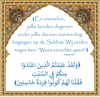 ﴾En voorzeker, jullie kenden degenen onder jullie die een overtreding begingen op de Sabbat. Wij zeiden tegen hen: “Wees verachte apen!” ﴿ el-Baqara:65