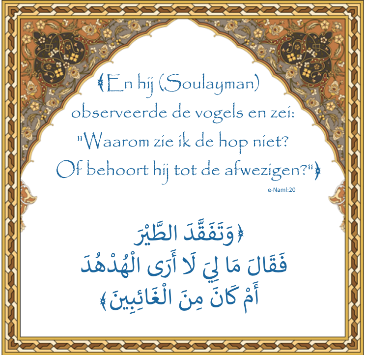 Het viel Soulayman een keer op dat de hop afwezig was. Als we beseffen dat het een immens grote menigte betrof, is het niet vreemd om je af te vragen hoe dit mogelijk is. Hoe is het te verklaren dat de afwezigheid van zo'n klein vogeltje opvalt in deze grote menigte van legereenheden?