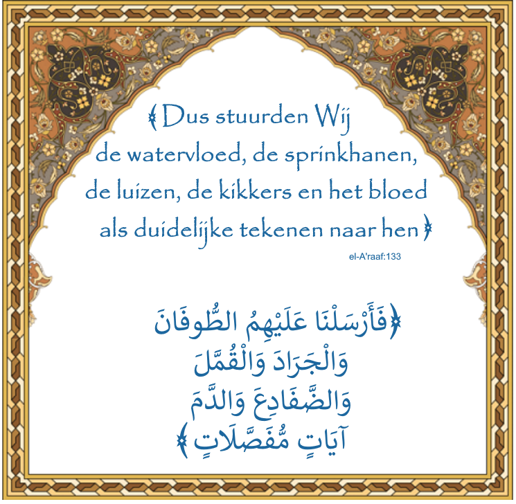 ﴾Dus stuurden Wij de watervloed, de sprinkhanen, de luizen, de kikkers en het bloed als duidelijke tekenen naar hen. Desondanks stelden zij zich hoogmoedig op en waren zij een misdadig volk﴿ el-A'raaf:133