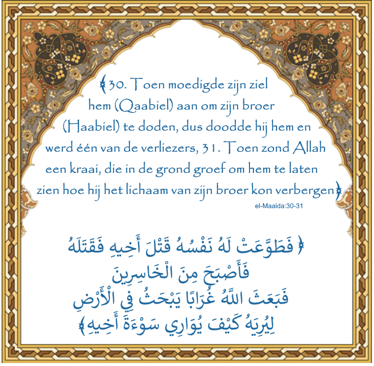 Na deze moord, heeft Allah ﷻ een kraai gestuurd om hem te laten zien hoe om te gaan met een dood lichaam. Omdat niet eerder een mens om het leven kwam, was voor hem niet bekend wat er moest gebeuren met een dood lichaam.
