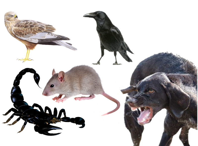 "Vijf soorten dieren zijn kwaad-doeners en mogen zelfs in het Heiligdom [Harram] gedood worden: de kraai, de kiekendief, de schorpioen, de muis en de dolle hond" (Boechari en Moeslim)
