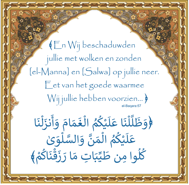 ﴾En Wij beschaduwden jullie met wolken en zonden [el-Manna] en [Salwa] op jullie neer. Eet van het goede waarmee Wij jullie hebben voorzien... ﴿ el-Baqara:57