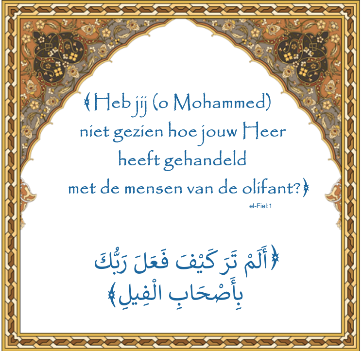 ﴾Heb jij (o Mohammed) niet gezien hoe jouw Heer heeft gehandeld met de mensen van de olifant? ﴿ el-Fiel:1