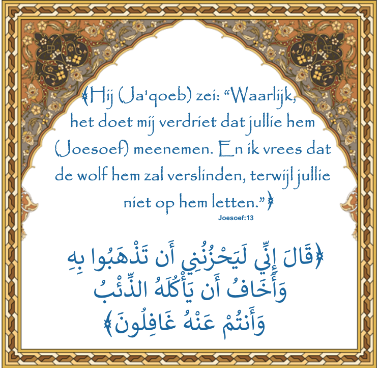 ﴾Hij (Ja'qoeb) zei: “Waarlijk, het doet mij verdriet dat jullie hem (Joesoef) meenemen. En ik vrees dat de wolf hem zal verslinden, terwijl jullie niet op hem letten.” ﴿ Joesoef:13